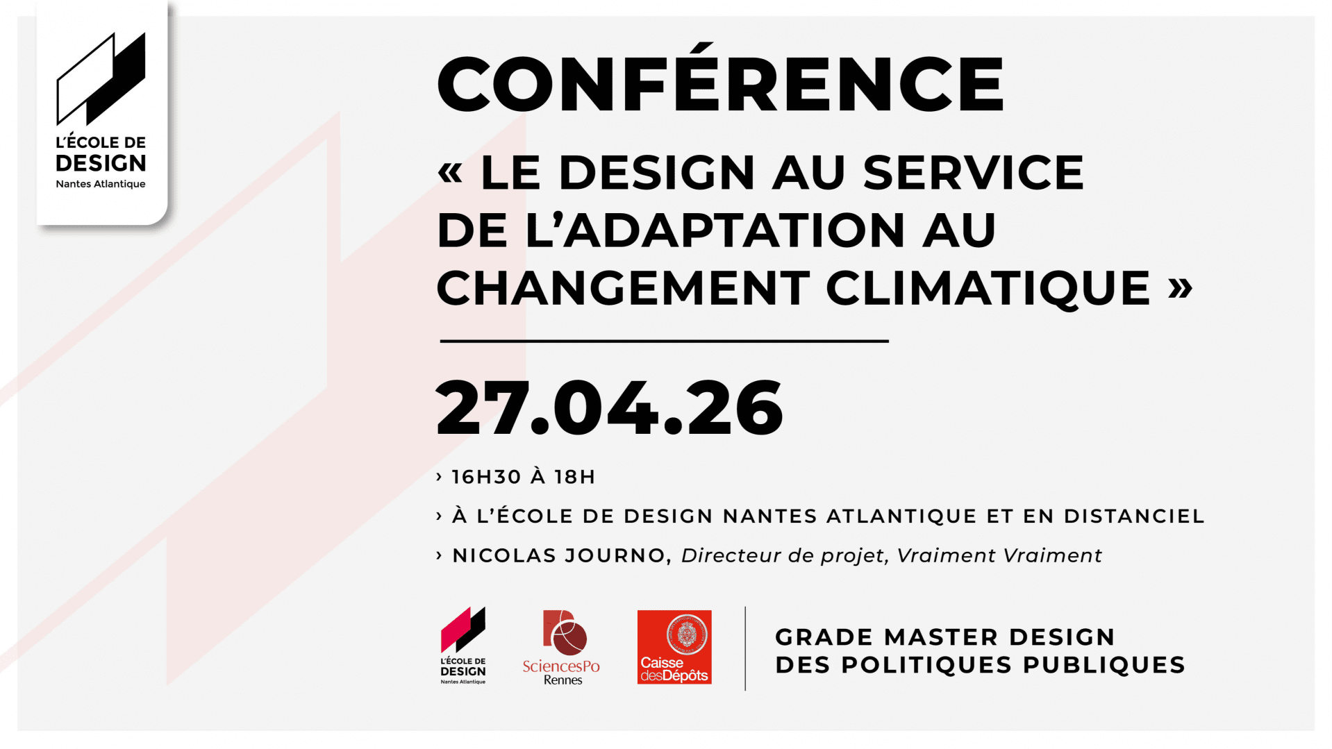 Afin d'explorer les synergies entre design et politiques publiques, l’école propose cette année encore un cycle de conférences ouvert au public, en partenariat avec la Caisse des Dépôts, dans le cadre du Grade Master Design des Politiques Publiques, lancé l’année dernière en partenariat avec Sciences Po Rennes.